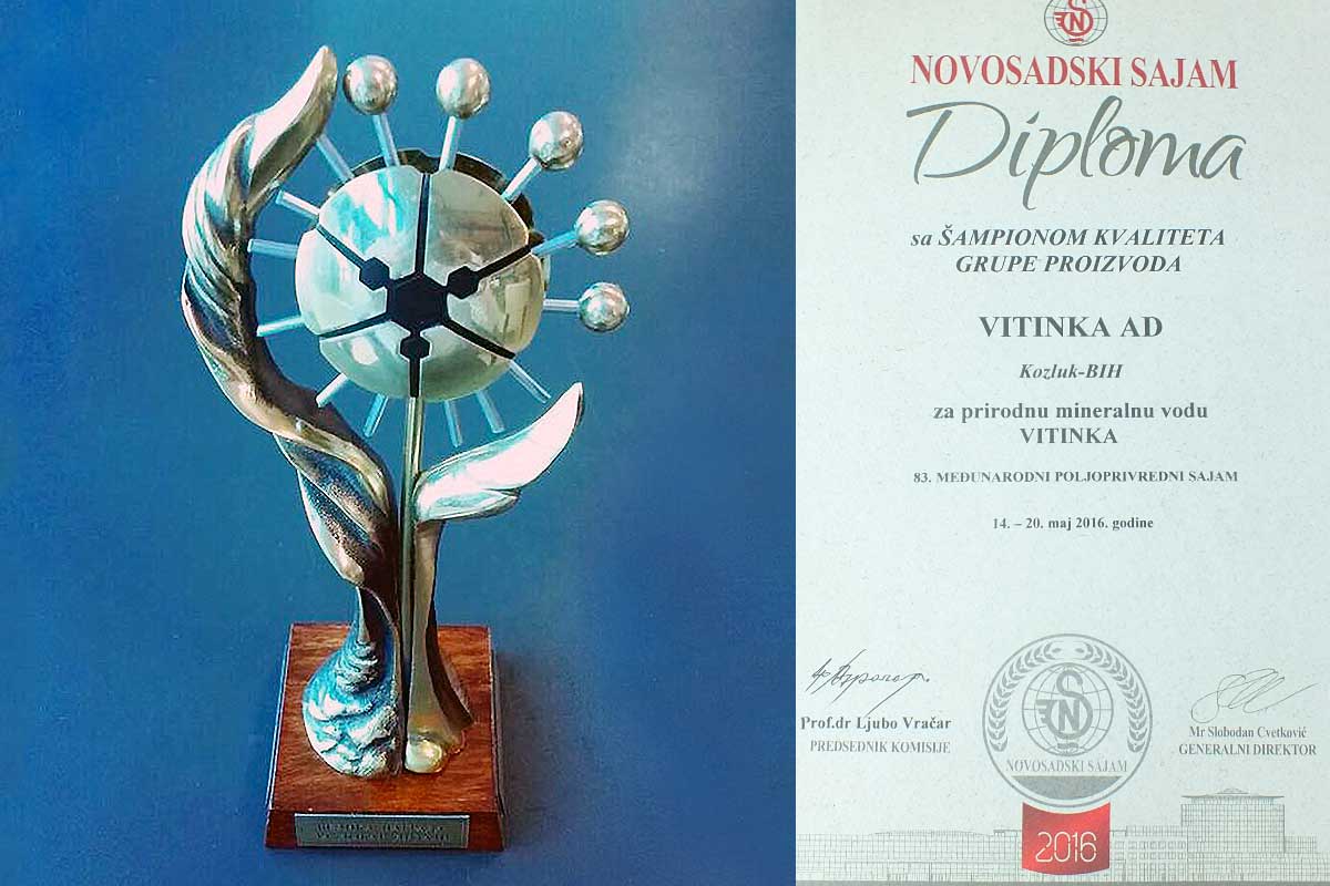 Voda uvijek nađe svoj put, a Vitinka iz Kozluka je upravo to i učinila pronašavši put do najviših svjetskih standarda. Neumoljiva kontrola kvaliteta rezultirala je da, na Međunarodnom poljoprivrednom sajmu, prirodna mineralna voda Vitinka u kategoriji robnih grupa „Vode i osježavajuća bezalkoholna pića“zasija kao „šampion kvaliteta grupe proizvoda“ za 2016. godinu.